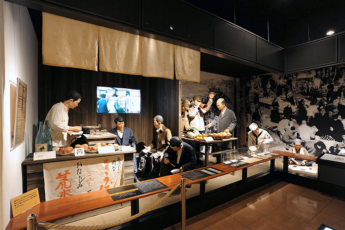 戦争終結後、各地にできた闇市のようすを写真にもとづき再現したもの。