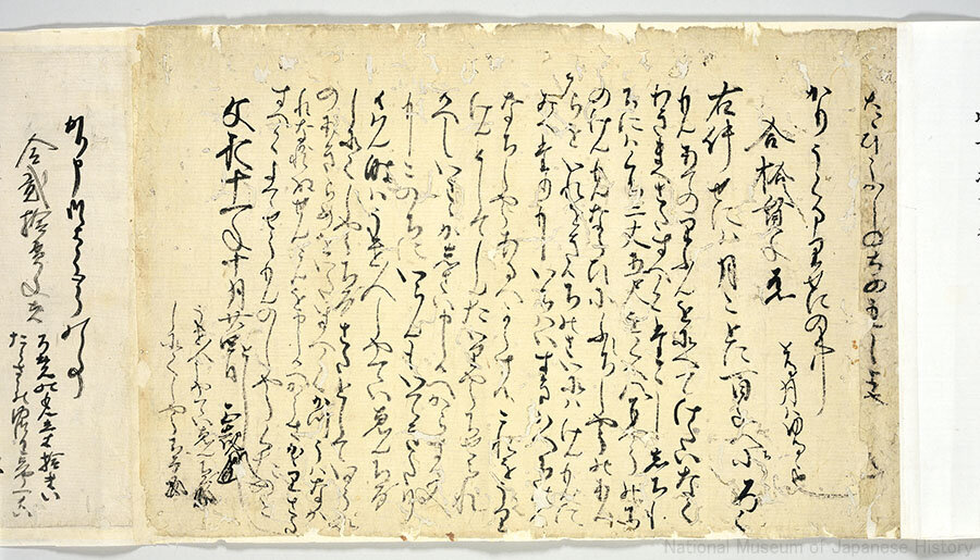 歴博が誇る古文書群である「田中穣氏旧蔵典籍(きゅうぞうてんせき)古文書」は、穣氏の祖父である田中勘兵衛教忠(1838~1934)が蒐集(しゅうしゅう)した古文書群である。教忠は個別の文書を内容ごとにまとめ、巻子(かんす)仕立てにした。その一つが「借銭状類古文書」になる。