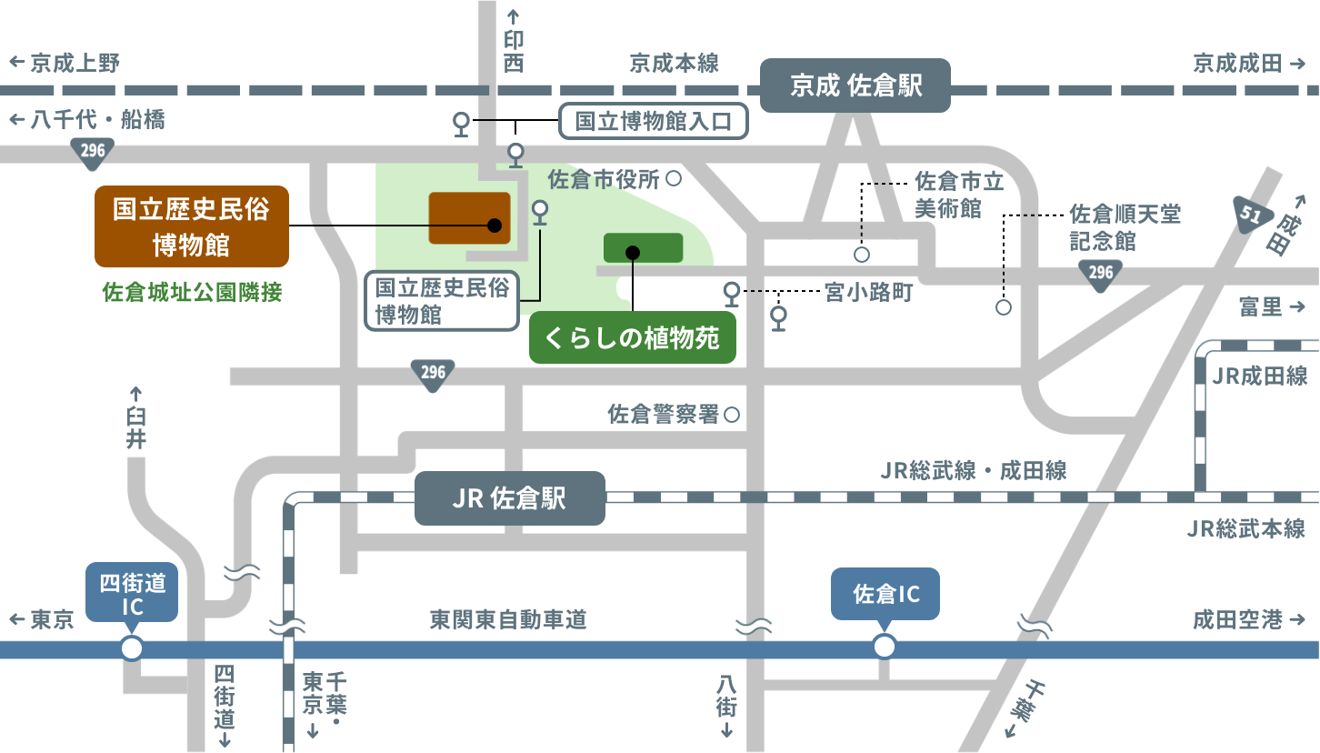 - 東京駅からJR総武本線「佐倉」駅(快速約60分)下車、バス(約15分)