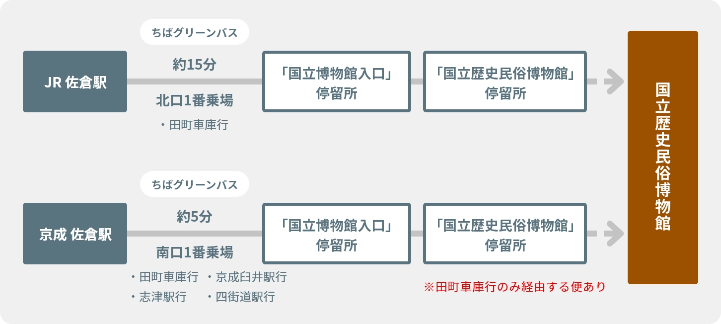 南口1番乗場から、京成バス千葉イースト田町車庫行き乗車、「国立博物館入口」または「国立歴史民俗博物館」下車
