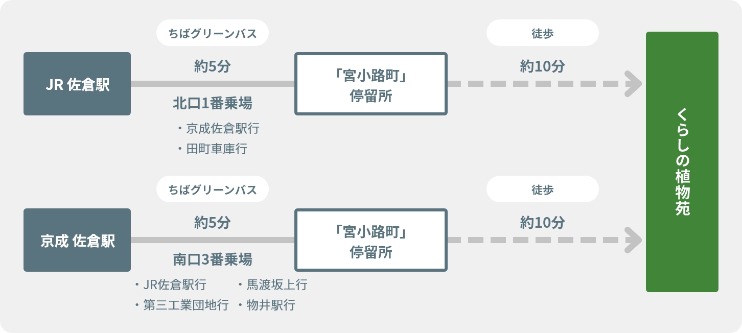 - 京成成田駅から京成本線にて「京成佐倉」駅下車、バス(約5分)