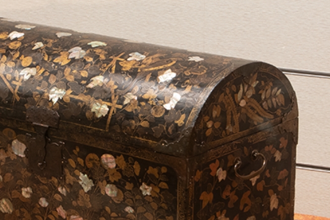 大航海時代。ヨーロッパの人々を魅了した日本の漆工芸品。相手の好みにあわせて日本の職人がつくったものもあるんです。漆の黒に映えて輝くのは意外な素材。何かわかるかな?