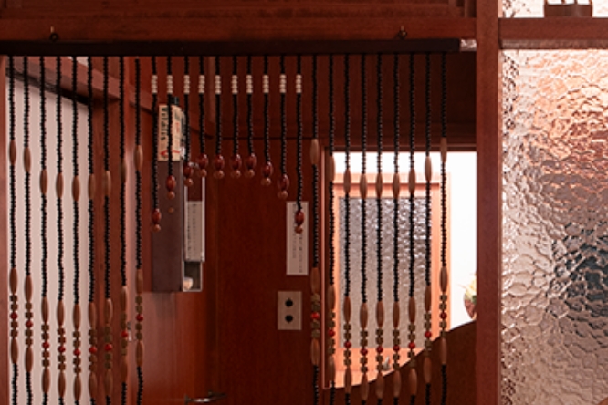 「どこのうちにもあったなあ!」と懐かしむ声も聞こえてきそう。大小の木の玉をつないで、空間をやさしくわけるこの物体。高度経済成長期の団地へ「ごめんください!」。