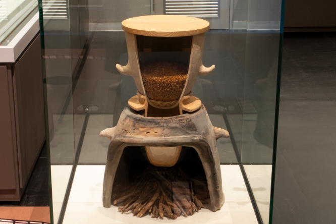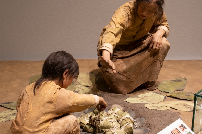 当時の食材は肉や魚、ナッツやおいもなど。ちょうど、むし焼きで食べようとしていますね。何で味つけしたのかな? 素材の味をたのしんでいたら、まさに元祖オーガニックといえるかも?