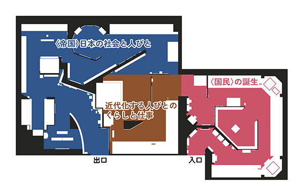 19世紀末から20世紀初頭、新しい経済のしくみが生まれ、くらしも大きく変わりました。戦争や人びとの交流をとおして、世界やアジア諸地域との関わりも深くかつ複雑になっていきます。こうした多様で複雑な人びとの経験に目を向けながら、近代日本のすがたを来館者の皆様とともに考えていく展示をめざしています。